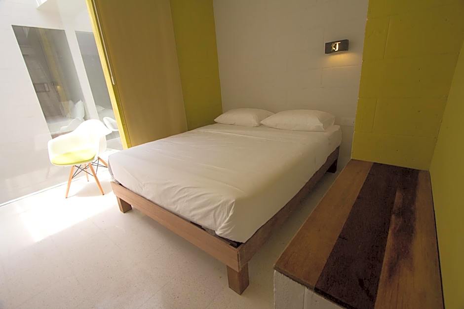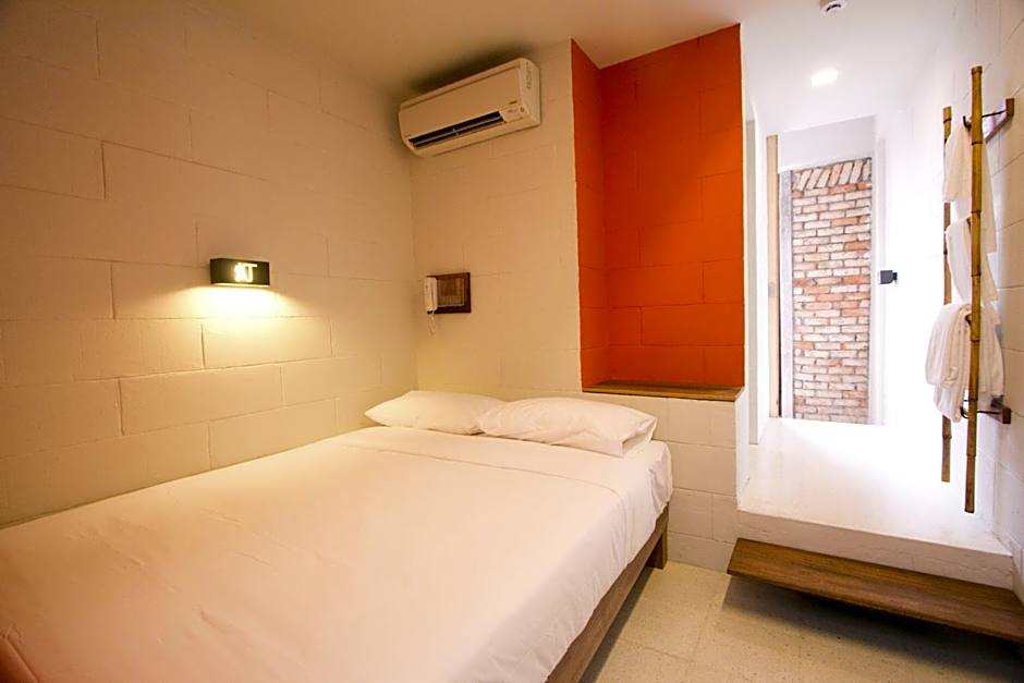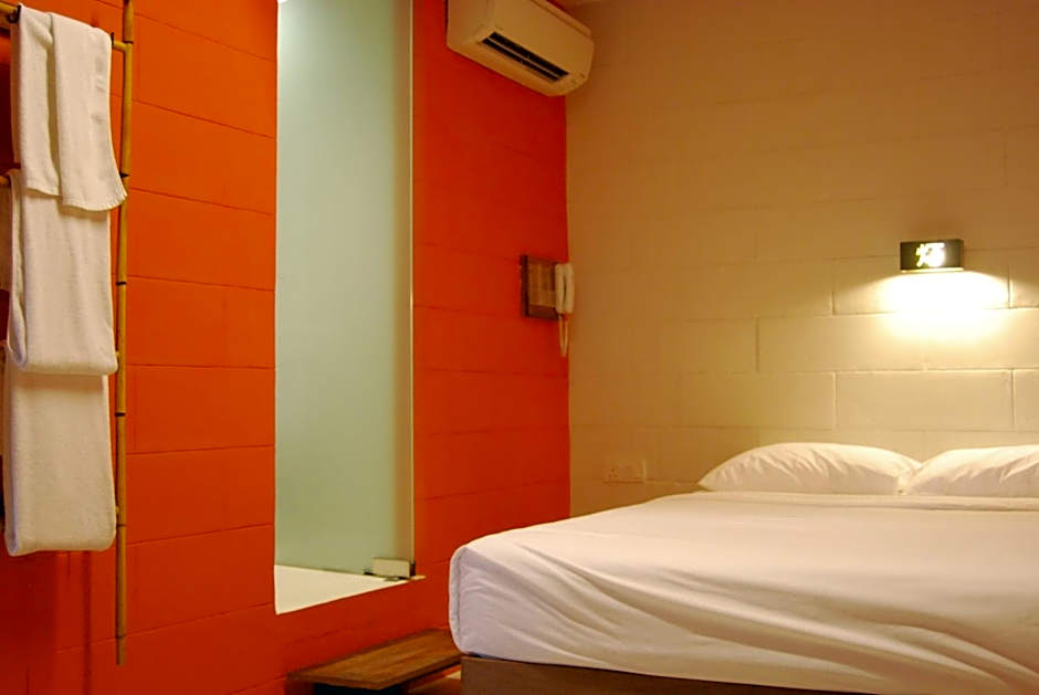 Modern rooms feature air conditioning, a queen-sized bed and a glass-box balcony overlooking the hotel's indoor courtyard. The private bathroom has hot/cold shower facility, towels and free toiletries.